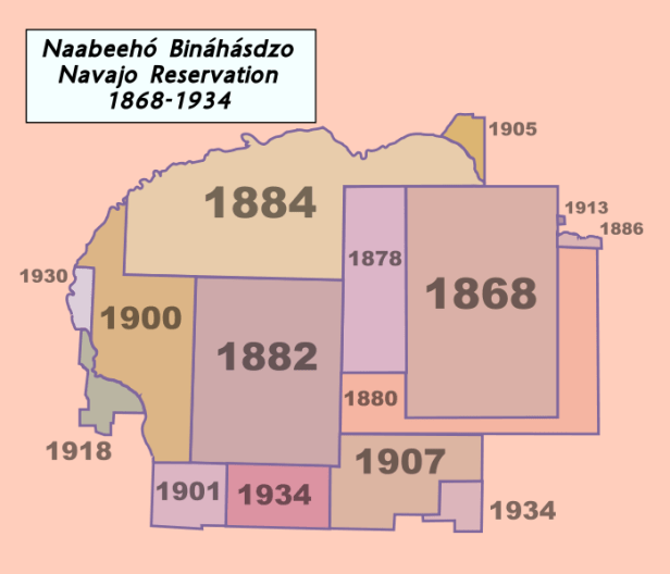 Nowadays their reservation is as shown on the above left map. It covers over 27,000 square miles, mostly in Arizona, but also in Utah and New Mexico. It was first created in 1868 – not too long after Kit Carson’s destruction. But, because of their growth in population thereafter – because peace finally came to the land – the Rez got bigger and bigger. It became the biggest in America.