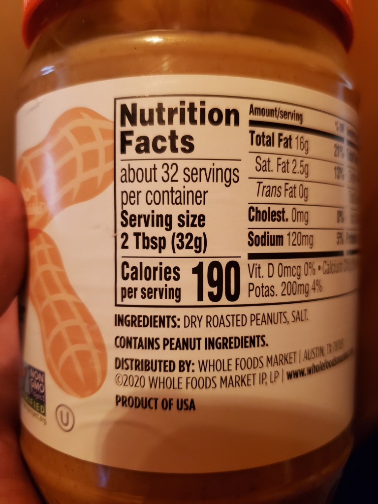 Look at this $5 jar of peanut butter’s “Nutrition Facts”. It has 32 servings. Each serving is 190 calories. 32 x 190 = 6,080 total calories in this jar. If you consume 1,500 calories per day, 6,080 is over 4 days worth of calories. For $5 dollars you have four days of calories. For $50 you have 40 days of calories. For $100 – 20 jars – you have 80 days.