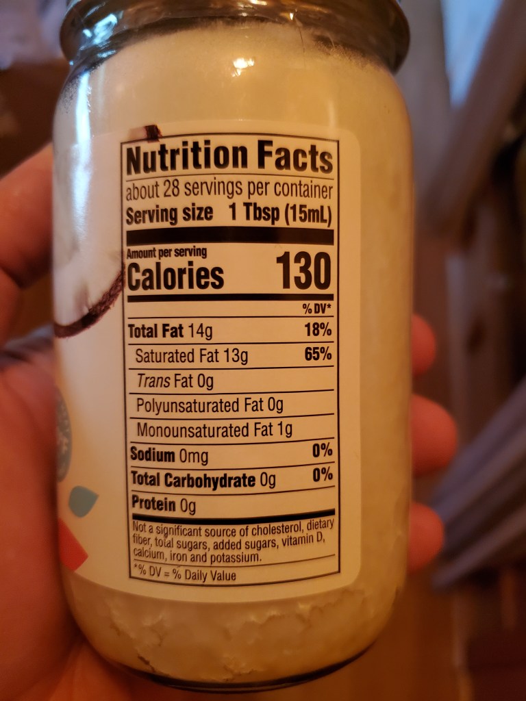 Of course, you don’t want only peanut butter. Why not mix it with coconut oil? This jar was $7 (it was pricier because it’s organic, and you can get cheaper jars). It has 28 servings. Each has 130 calories. 28 x 130 = 3640 calories, or 2.4 1500-calorie days.
