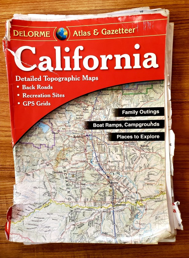 My California DeLorme is tattered. But DeLorme’s road atlases are the best. The pages are essentially topographic maps with roads and cities imposed upon them. You see where mountains hem in Los Angeles. You see the elevation of the desert you’re standing in as you look up to the Lower 48’s highest point west of Lone Pine at Mount Whitney. The lines and colors titilate the imagination and make you want to travel there… at least if you’re nerd.