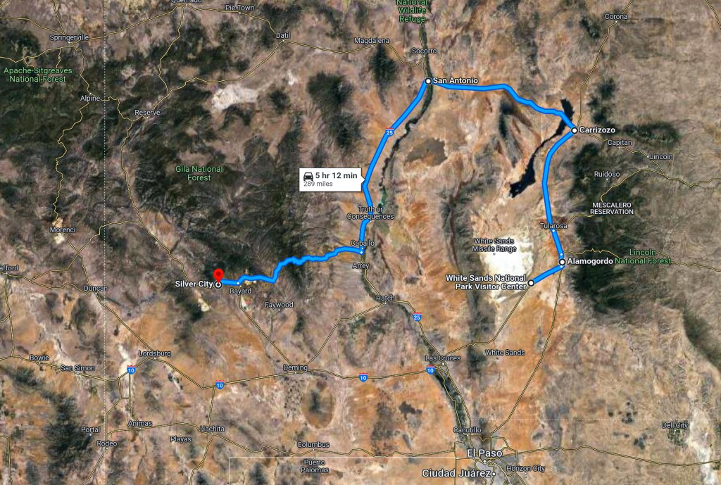 My destination, again, was Silver City. The route we’d take is below (if you give a damn). I took the longer route because the shorter one through Las Cruces would have forced me through a border patrol checkpoint. I hate those EXPLETIVE things. Those bastards have given me hell before. I avoid them. The 4th Amendment means nothing to them. NOTHING.