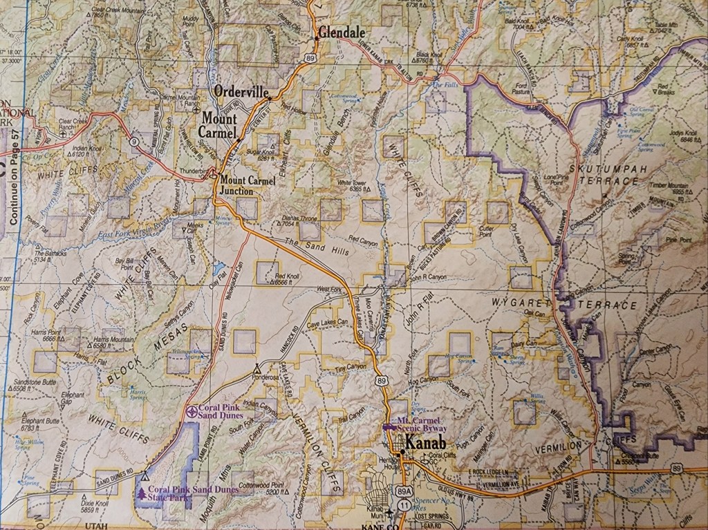 Now, Kanab is at the base of the Grand Staircase Escalante National Monument – a federal zone that was so offensive to Utahns that then President Bill Clinton ceremoniously signed into law the Staircase from the Grand Canyon, because the governor of Utah didn’t want Clinton in his state. Putting politics aside, the staircase is a series of multi-colored cliffs, which rise like a staircase upward from south to north, and rises from a base elevation of roughly 5,000′ to a top elevation of 9,000′. Shinarump, Vermillion, White, Gray and Pink, are the names of each band. You get a splendid view of them from US 89 while still in Arizona, coming down from the Kaibab Plateau.