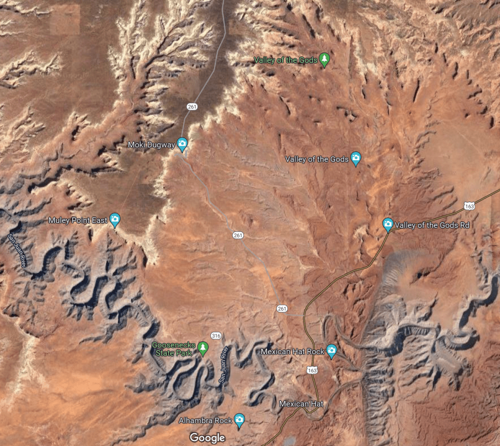 The easiest way to get to this part of Utah is heading west on Utah 95 from Blanding on US 191, and then south on Utah 261, which is in the snippet below. A more harrowing way is to ascend the steep and vertigo-inducing Moki Dugway on Utah 261, which runs northwest from US 163 just north of the thriving metropolis of Mexican Hat, Utah.