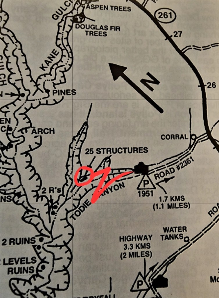 We followed the south rim of Toadie Canyon. used the map to spy the ruins just below the north rim of Toadie Canyon from the south rim. To get to them we’d have to hike down to the bottom. This would involved lots of brush, and I was wearing sandals. Plus, a monsoon storm was building overhead, and neither of us wanted to get caught in a downpour. So we went back to our vehicles and waited.