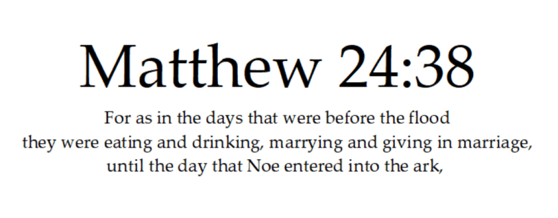 At the same time, I am reminded of Matthew 24:38 in which Jesus says, “For as in the days that were before the flood they were eating and drinking, marrying and giving in marriage, until the day that Noe entered into the ark, and knew not until the flood came, and took them all away…” This is to say that in spite of Noah’s dire warnings, no one did anything to prepare for what was coming. They went on with their lives as if everything were normal. They focused only upon their immediate circumstances without questioning what all their striving was for if the world was literally going to end.