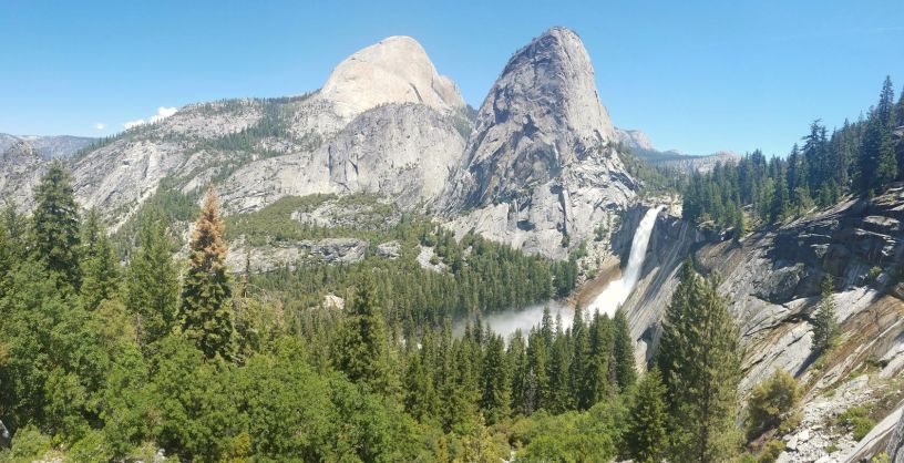 Then, lo, the Nevada Falls from the side. I captured it in a panorama photo with granite domes named Liberty Cap and Mount Broderick rising above the falls. Here Yosemite was relentlessly trying to win my heart even more.