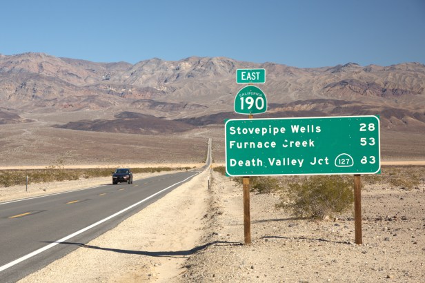 I was heading to Stovepipe Wells this day. That 28-mile drive from this sign at, essentially, the very bottom of this valley is a winding, tumultuous path which you cannot travel at 60 mph. It took me almost an hour to get to Stovepipe from here.