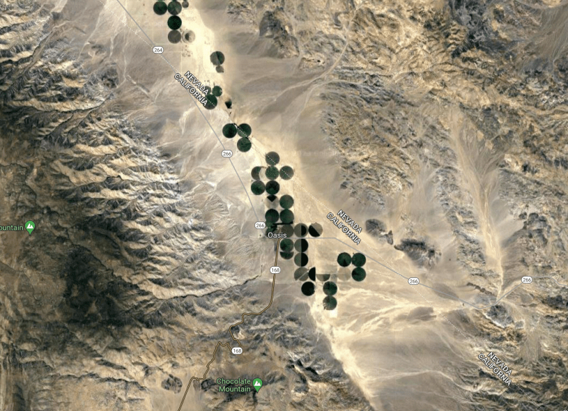 Then, I went over another divide to an endohoeric basin still in California where a place called Oasis is. It’s just west of the Nevada border. It was amazingly green. It was pretty. However, surely it gets hot and brown as hell in dry years here.