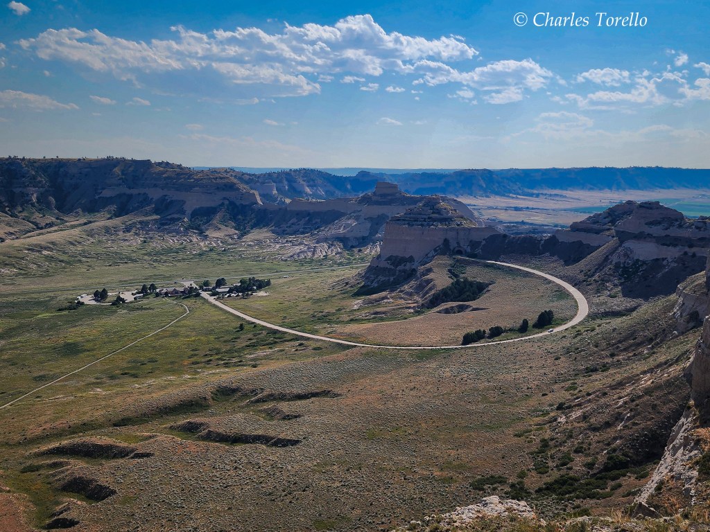 And this last thought really hit me while standing atop the actual Scott’s Bluff, about 20 miles west of Chimney Rock. Here is a National Monument with a road to the top of the bluff which affords cool breezes and vast views of the town of Scott’s Bluff 800 feet below. The town looked clean and green and the result of determined farmers whose ancestors in Europe probably had better rain and soil but less freedom. That freedom motivated them to tame this “Desert”, which looked more apparent with a higher view of the far, brown horizons.