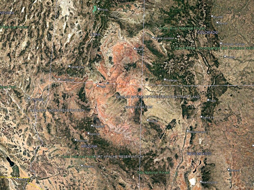 The Plateau covers Western Colorado, Northwestern New Mexico, Southern Utah and Northern Arizona. You can see a Google Earth screenshot of the Colorado Plateau below. See the red earth. That’s iron-oxide colorized sandstone.