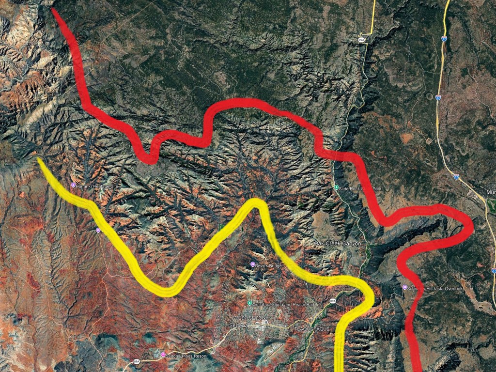 And below I have painted a yellow line and a red line on the above image. The yellow indicates the base of the Mogollon Rim. The red indicates the top of the Mogollon Rim. The exact path of both lines is a little arbitrary, as all geography can be arbitrary in transition zones. But you now have a general idea.